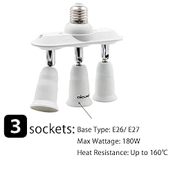 Max Wattage Allowance is 180W. Voltages Range: 100~240V, suitable for standard E26 base halogen, LED bulbs, CFL bulbs. [For safety, the total weight of bulbs installed should not exceed 300g/10.58oz.] This 3 in 1 light socket splitter adapter is CE certificated. Each lamp socket is made of anti-aging and anti-burning PBT, 160℃ heat resistance, outstanding thermal stability, safe and durable. No fire hazard. ▲ Please keep it out of enclosed fixtures to ensure good heat dissipation. This splitter adapter is horizontal designed. Each socket is 360° rotating and 180° bending available, convenient for you to adjust the lighting angle according to you needs. Easy to use. Simply screw the socket adapt into E26 type socket, then screw in E26 bulbs, no need of tools. Widely used for home, office, bedroom, drawing room, exhibitions and perfectly work for photography. Satisfy you different lighting requirements.
