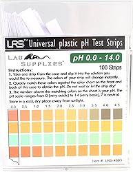 Ideal for testing Water, Soap, Soil, Kombucha, Beer, and much more! Sold as One Case of 100 Plastic pH Strips pH 0.0-14.0 Full Range Test Strips - Increments by 0.5 pH units pH Color Chart Intervals: 0.0, 0.5, 1.0, 1.5, 2.0, 2.5, 3.0, 3.5, 4.0, 4.5, 5.0, 5.5, 6.0, 6.5, 7.0, 7.5, 8.0, 8.5, 9.0, 9.5, 10.0, 10.5, 11.0, 11.5, 12.0, 12.5, 13.0, 13.5, 14.0 Laboratory and Diagnostic grade pH test strips