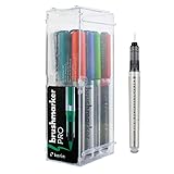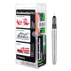 - Karin Brushmarkers PRO contain 2.4ml of color each. They were produced with 'liquid inK' technology, which means the intensity of color lasts through the last drop. They are twice as efficient as traditional filter markers. In addition, they are equipped with a Japanese super durable and flexible nylon tip. They contain non-toxic paints with an intense dye based color. The colors can be mixed, lightened and obtain tonal transitions by touching the ends of two different markers. This package contains twelve Brushmarker Pro (Canary 166, Amber 195, Red 209, Lilac 226, Royal Blue 045, Turquoise 654, Cerise 375, Ocean Teal 377, Grass 253, Henna 105, Black 030, + Blender). Imported.