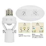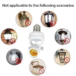 Screw-In Motion Sensor Light Socket Indoor Outdoor: Screw-In Motion Sensor Light Socket Indoor Outdoor Instantly upgrade any E26/E27 bulb (LED/CFL) to smart lighting. No wiring – screw into existing sockets as a plug-and-play adapter. The smart motion sensor light socket can detect human body's infrared, and use infrared to control E26/27 bulb to auto turn on or off within 6.6yd/6m. Don't place the motion sensor socket into glass enclosure. Glass will affect the use of PIR sensors. The motion activated light sockets can only work in an open lampshade. Outdoor Waterproof & All-Weather Durability: IP65-rated waterproof design withstands rain, snow, and dust. Ideal for patios, driveways, and damp areas like basements/garages. The light bulb holder adapter can be set by Time(10s-5min) and Lux illumination (5-100lux). Turns LUX knob clockwise to the maximum(SUN) which means the motion sensor socket connected with bulb will be working even in daylight. Turns LUX knob anti-clockwise to the minimum NIGHT) which means the switch only works in evening. Adjustable Angled Detection 120° angled motion sensor with 16-23ft range. Optimize coverage for stairs, corners, or narrow spaces. Turned time knob anti-clockwise to the minimum (10s), which means the bulb will be lighting ¡À10 seconds. Turned time knob clockwise to the maximum (5m), which means the bulb will be lighting 5 minutes. Auto On/Off & Energy Saver Lights activate in darkness, shut off after 3-5 mins (adjustable). Reduce energy waste by 40% vs. manual switches. The E26 E27 light bulb adapter uses a good sensitivity detector integrated circuit. It has automatic, convenient, energy-saving and practical functions. It uses human infrared energy as a control signal source. When someone enters the detection area, it starts working. It can automatically identify day and night. Multi-Scene Security & Safety Prevent falls on stairs/porches, deter intruders in garages/patios, and light up closets/storage rooms hands-free. Wide Application Indoor Motion Sensor Light Bulb Socket:Suitable for E26 E27 screw bulb. The motion sensor light bulb socket could be used in garage, closet, basement, laundry room, porch, pantry room, storage room, corridor, aisle and stairs, hospitals, exhibition halls.