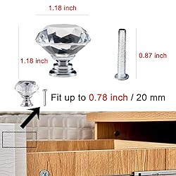 Material: Crystal glass and aluminum, solid structure and shiny&glittering appearance, best adornment for your home and office. Size: The knobs diameter approx 1.18inch (30mm), height approx 1.18inch (30mm) Application: The crystal knob is very pretty artistic and durable, Ideal for cabinet, dresser, drawers, cupboards, wardrobes, bookcase in your home, kitchen, bathroom, living-room, book-room, dorm and office. Best for decoration. Easy to Install: Find the position where you want to install on the board and drill a hole, then pass through the screw from the back of board and thread tight to the knob. Screws size is 0.87inch(22mm), fit up to 0.78inch(20mm) thickness. You may need to purchase screws of other length depending on your cabinet’s thickness. Package includes: 12 * Crystal knobs and 12 * Screws