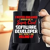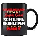 Software Developer COFFEE MUG - The quote on the mug reads: I Never Dreamed I Would Be A Super Cool Software Developer But Here I Am Killing It THE PERFECT GIFT - A cool and unique gift on a budget. Your mom, dad, wife, girlfriend, boyfriend, friend, work colleague or neighbor are going to LOVE this ceramic coffee mugs! Perfect for any occasion: Birthday, Christmas, Party, Thanksgiving. Buy Now! PRINTED IN THE USA! - This coffee cup is proudly printed right here in the USA! 100% Customer Satisfaction Guarantee. Shop with Absolute & Complete Confidence that you're making a very smart decision! Buy Now! THE COFFEE MUG - The Coffee and Motivation Mug can be used for coffee, tea, hot chocolate, soup, juice, beer, wine, whiskey or any liquid of your choice. It can also be used as a pen or pencil holder. It's specially designed with a large handle to provide you with a comfortable grip while preventing you from burning your hand. HIGH QUALITY - This high quality ceramic mug has a premium hard coat that provides crisp and vibrant color reproduction sure to last for years. The imprinted design is printed on both sides. It's dishwasher and microwave safe. Perfect for all hot & cold beverages. Treat yourself with this awesome coffee cup and buy more to make someone special very happy.