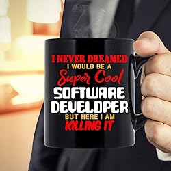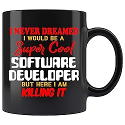 - Best Quality and Originality: Buy an awesome Software Developer coffee mug for the one you know, the one you work with or the one with you are related to! The unique and funny coffee or tea cup is a great way to express your love and gratitude towards your special one. That special one may be your friend, parent, better half, colleague, your boy or girl friend. It doesn’t a matter. Creative gifts will be liked by all. Best Quality: All ceramic mugs feature printing on both sides that is guaranteed to last for years. Our coffee cups are dishwasher and microwave safe and are great for home and restaurant use. The mugs are made of 100% pure black ceramic and have a large easy grip handle. All of our ceramic mugs are printed in the USA. 100% total and complete satisfaction guaranteed! Unique and funny: One thing that can make your day is a good laugh with an old friend while drinking from a funny coffee mug. Another is a relaxing moment shared with the aroma from a warm cup of coffee or tea with a unique message that will cheer you up and motivate you during the whole day. This unique Software Developer mug is a great idea to make people remember you with every sip they take. Classy: By holding a stylish coffee mug in your hand, you make a classy statement in a silent way. Get the unique custom coffee cups with unforgettable title I Never Dreamed I Would Be A Super Cool Software Developer But Here I Am Killing It, add to your collection and impress people with your amazing style. Memorable gift: Our Unique and Funny coffee mugs are intended for coffee lovers and for all who enjoy a perfect coffee cup. When you buy our personalized coffee mug for someone, they will remember you every morning with a warm smile on their face. Design:B3