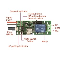 DC 5V WIFI Relay Module,working model Inching or Self-locking ,change work mode by pressing the mode button on board. default inching time is 0.5 second,if need to change inching time,you have to set it to self-lock mode firstly by pressing mode button,then adjust inching time in ewelink app. WIDELY Usage,The WiFi Smart Switch Module can be applied to 97% home appliances,add wifi to your garage door opener lights fireplace computer.Support 2.4G WIFI only,if your router with dual bands and same SSID,please change to different SSID or close 5G firstly.When pairing,please be sure to put the relay close to your router.if can't configure with quick mode,please try to use compatible mode Two pairing method,quick mode and compatilbe mode.Once it's power on,red light will flash 2 short 1 long,it is in quick mode, no need to press pair button,open ewelink app,it will find your SSID automatically,enter your correct wifi password.If quick mode doesn't work,please use compatible mode.press the pairing button about 8 second until red light quickly blink,open ewelink app and scroll down to find compatible mode,there is instruction step in app Voice control,once configured with ewelink app,link it to Alexa Google assistant,use your voice comand to control your home when busy.And you can use Siri by creating shortcut Timing and share with family,you can creat 8 group count down/up schedule timer at most,share with others to use phone wifi control lights garage etc