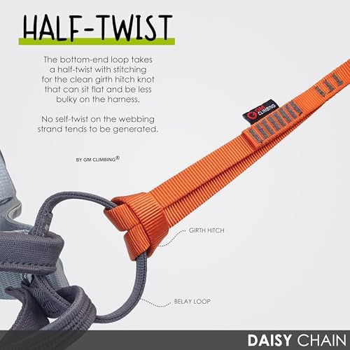 • 【Half-twist Long Loop】The long end loop on the Daisy Chain takes a half-twist with stitching for a clean girth hitch knot that sits flat and reduces bulk on the harness. No self-twist is generated in the webbing strand. This half-twist end loop integrates an appropriate margin in length for comfortably hitching to either the belay loop or the tie-in loops.