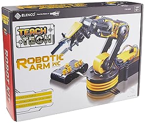 - "Robotic Arm Wired Controlled allows young engineers to learn the basics of robotic technology! The innovative robotic arm has an extensive range of motion through all pivot points. It's an introduction to Robotics and Mechanical Engineering that will excite young and old engineers. This STEM robot has five motors that power five joints for optimal control and movement. Develop problem-solving skills while assembling and while having fun! Lifting capacity: 3.5oz (100g). Horizontal reach 12.6in. (320mm). Vertical reach 14.96 in. (380mm).Base rotation range 270°. Base motion range 180°.Elbow range 300°. Wrist motion range 120°.4 D batteries required, not included. Tools that might be needed: diagonal clippers, a screw driver, safety goggles. Elenco Teach products are based on STEM activities (Science, Technology, Engineering, Math) to teach and encourage kids in their development, all while having fun! Perfect for future engineers ages 12+."