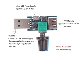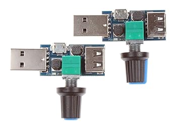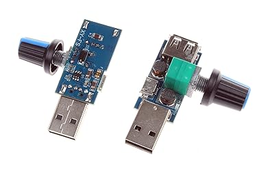 - Note: When used to adjust the fan in two stages, please put the fan in one gear, otherwise it may not be able to adjust the speed! Description The stepless speed regulator output voltage range smoothly changes between 3V-8V, so the fan wind speed can be adjusted, comfort greatly increased! Turn the knob clockwise to increase the air volume. Turning it counterclockwise will make the air volume gentler and the knob has a switch function! Usage: Insert the governor into the mobile phone charger or charging treasure, then insert the fan USB plug into the USB port of the governor, and then adjust the large volume of small air volume by turning the adjusting knob. Parameter Power supply range: 4V to 12V ( USB port). Output range: 3V-8V (Not fit 12V USB fan). Rated power: 5W (Do not overload.) Package Included: NOYITO 5V USB Fan Stepless Speed Controller (Pack of 2)