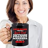 - Best Quality and Originality: Buy an awesome Software Project Manager coffee mug for the one you know, the one you work with or the one with you are related to! The unique and funny coffee or tea cup is a great way to express your love and gratitude towards your special one. That special one may be your friend, parent, better half, colleague, your boy or girl friend. It doesn’t a matter. Creative gifts will be liked by all. Best Quality: All ceramic mugs feature printing on both sides that is guaranteed to last for years. Our coffee cups are dishwasher and microwave safe and are great for home and restaurant use. The mugs are made of 100% pure black ceramic and have a large easy grip handle. All of our ceramic mugs are printed in the USA. 100% total and complete satisfaction guaranteed! Unique and funny: One thing that can make your day is a good laugh with an old friend while drinking from a funny coffee mug. Another is a relaxing moment shared with the aroma from a warm cup of coffee or tea with a unique message that will cheer you up and motivate you during the whole day. This unique Software Project Manager mug is a great idea to make people remember you with every sip they take. Classy: By holding a stylish coffee mug in your hand, you make a classy statement in a silent way. Get the unique custom coffee cups with unforgettable title I Never Dreamed I Would Be A Super Cool Software Project Manager But Here I Am Killing It, add to your collection and impress people with your amazing style. Memorable gift: Our Unique and Funny coffee mugs are intended for coffee lovers and for all who enjoy a perfect coffee cup. When you buy our personalized coffee mug for someone, they will remember you every morning with a warm smile on their face. Design:B3034