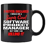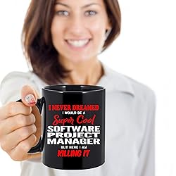 Software Project Manager COFFEE MUG - The quote on the mug reads: I Never Dreamed I Would Be A Super Cool Software Project Manager But Here I Am Killing It THE PERFECT GIFT - A cool and unique gift on a budget. Your mom, dad, wife, girlfriend, boyfriend, friend, work colleague or neighbor are going to LOVE this ceramic coffee mugs! Perfect for any occasion: Birthday, Christmas, Party, Thanksgiving. Buy Now! PRINTED IN THE USA! - This coffee cup is proudly printed right here in the USA! 100% Customer Satisfaction Guarantee. Shop with Absolute & Complete Confidence that you're making a very smart decision! Buy Now! THE COFFEE MUG - The Coffee and Motivation Mug can be used for coffee, tea, hot chocolate, soup, juice, beer, wine, whiskey or any liquid of your choice. It can also be used as a pen or pencil holder. It's specially designed with a large handle to provide you with a comfortable grip while preventing you from burning your hand. HIGH QUALITY - This high quality ceramic mug has a premium hard coat that provides crisp and vibrant color reproduction sure to last for years. The imprinted design is printed on both sides. It's dishwasher and microwave safe. Perfect for all hot & cold beverages. Treat yourself with this awesome coffee cup and buy more to make someone special very happy.