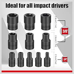 ROBUST DURABILITY - Crafted from drop-forged and heat-treated advanced Chrome Vanadium Steel, these sockets offer exceptional durability and serviceability. Their corrosion-resistant black phosphate finish ensures longevity. SMALL SIZE VARIETY - This set comes with five 1/4" Drive Sockets: E4, E5, E6, E7, E8, offering a diverse range of sizes for small-scale torque applications and detailed work. LARGER SIZE DIVERSITY - Alongside smaller sockets, the set includes six 3/8" Drive Sockets: E10, E12, E14, E16, E18, E20, ensuring that larger torque tasks are also catered to in this all-in-one kit. ORGANIZATION ESSENTIAL - The SEDY 11-Piece E-Torx Socket Set includes a red single handle socket organizer, keeping your high-quality black E-torx sockets arranged and easily accessible. UNIVERSAL APPLICATION - Whether you're a professional mechanic or a DIY enthusiast, this E-Socket set is a garage necessity, designed for use with most automobile models, ensuring broad compatibility and practicality.