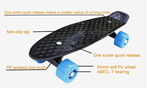 - [DURABLE AND STURDY] The Mini Kids Skateboard, Assembled with 17" long x 5" wide bendable non-slip PP deck which made of 100% fresh material and pp wrapped 3" pro iron trucks. Max load weight 100lbs, it is with one screw release system, which can get a smaller radius of turning circle for making a turn.