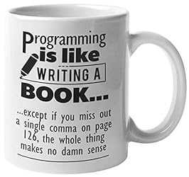 - GIVE THE BEST EVERY TIME!The best gifts are both personal and functional, and that’s why this awesome, original mug is a fantastic choice for nearly any occasion. You can surely relate to this funny statement. Codes need to be checked meticulously because a little mistake could ruin everything. Buy this mug from your school's merchandise store and give it to your fellow coder. This funny statement would help him remember to put comma after a certain code. Relax. You can fix that problem after a cup of coffee with your friend. This 11 ounce, white ceramic coffee mug has a large, easy-to-grip C-handle and is both microwave and dishwasher safe. The premium full color sublimation imprint appears on both sides of this 11 ounce, white ceramic mug. Each mug is crafted from the highest grade ceramic, and our designs are printed and sublimated in the United States. GET YOUR MUG TODAY!!