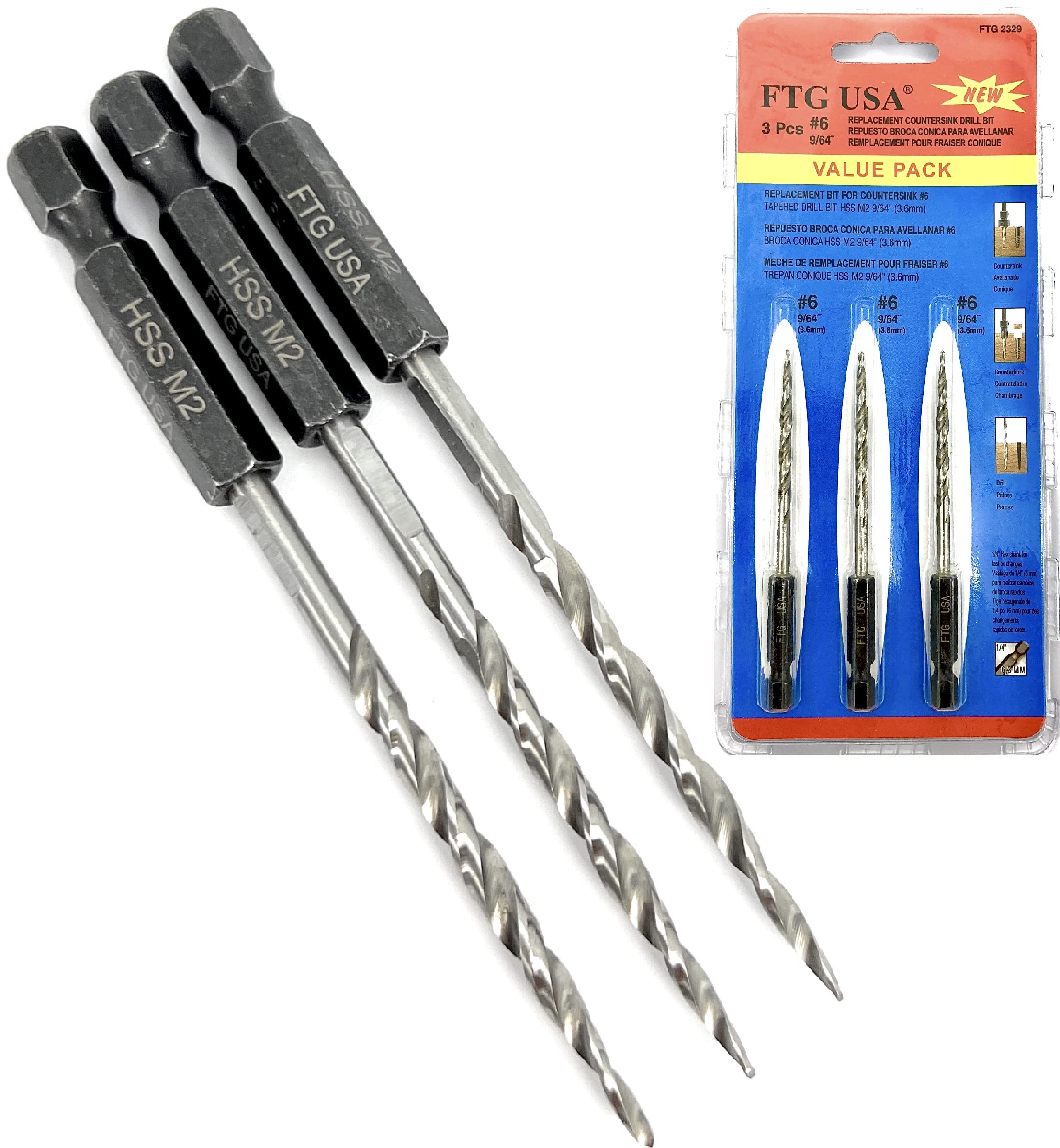 Countersink drill bit set for wood with tapered drill bit , 4 Flute countersink cutter #45 Carbon Steel, tapered countersink set features 4 Piece drill set All Same Size drill bits with countersink #6 (9/64") Adjustable wood countersink, 1 Depth Stop Collar 3/8", 1 Hex Wrench (1/8" Allen Key). Counter-bore, and wood plugs size 3/8 inch. Hex shank compatible with 1/4" standard Quick Change chuck including impact drills. FTG 2339P counter sinker drill bit for wood Wood drill bit set with counter bore chamfer angle 82 degree, smooth countersinking in hard and soft wood, tapered holes for screws. Adjustable countersink drill bit with quality built depth adjustable counter bore attaches to flat on shank with 2 hex screws for controlled pilot hole depth. Best adjustable wood countersink drill bits set ideal for woodworking. Countersink tool set made with countersink bits for wood Tapered drill bits pointed tip and wide flute for drilling fast, clean pilot hole, ensures tight fit for screws. Countersink hex drill bit set with tapered drill bit can be replaced with FTG replacement taper drill bits countersink for extended wood bit. Countersink drill bits for wood made to drill, countersink, and counter-bore in 1 step sink counter set. Counter sink bits designed as to work as wood drill bits THIRD-PARTY TESTED by US Accredited Lab - HSS M2 Grade 6542 countersink drill bit for wood with tapered drill bits. Wood countersink bit with wider flute shape for increased chip flow. Drill countersink set has logo brand name laser printed on each countersink bit quick change 1/4" hex shank. Tapered drill bit with countersink set, drill bits secured with pin, professional FTG Maximum Torque countersink bits for wood. Packaging set combination unique design protected by US Copyright Office STORAGE CONTAINERS for this set available below on this page at section " Make it a bundle". Counter sinker drill bit set designed in New Jersey by Fair Trade Group USA and Professionally manufactured in China at FTG USA specs. Analysis Report issued 4/27/2021 by ANAB US Accredited Lab, confirms that drill bits set High Speed Steel Quality countersink bits meet desired specs of HSS M2 Grade 6542, drill bit set harder than HSS 4241 and HSS 4341 used in other similar tapered countersink drill bits