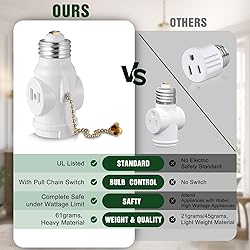 SAFE MATERIAL -The UL Listed adapter is composed of Eco-friendly Urea Resin, copper connector.The outlet receptacle carries electric rating up to 660W 125V. And the extended socket carries a E26 Screw bulb light up to 250W HANDY OUTLET ADAPTER -Easy way to add an outlet where you need it.Play and plug, no need to pay an electrician when you can make power available yourself WITH PULL CHAIN SWITCH -The pull chain add a switch of the place where there isn't a light switch. Even there is a power switch, the pull string could be conveniently used to control the separate light bulb WIDE APPLICATION - Great way to add outlets for Christmas LED string lights;connect shop lights to an existing bulb socket;plug in security camera into front door light socket/ porch light socket;install strip lights/T5 LED Light with an AC plug; Perfet for adding a temporary outlet at a light socket in garage,basement,workshop,utility room etc