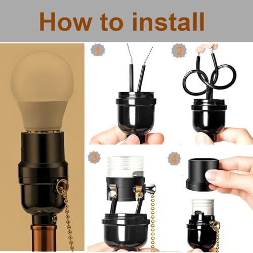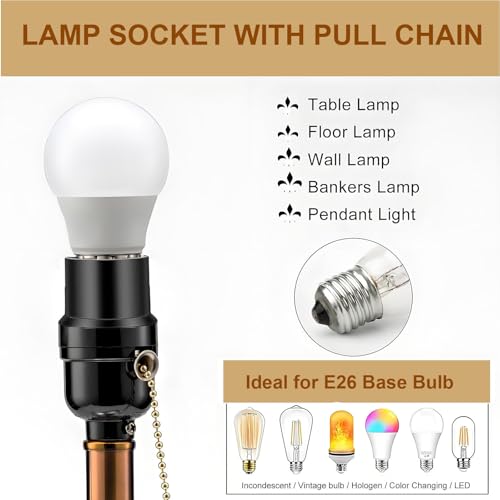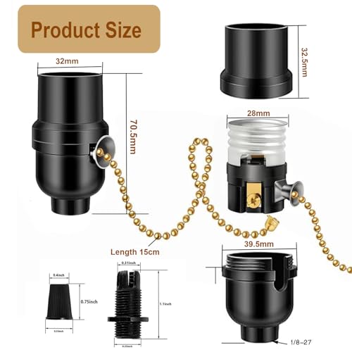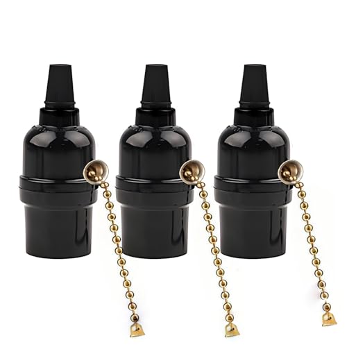 package content 3 pcs of E26 Light Sockets. Specifications: This is a good supply for creating vintage or industrial style lighting or just to replace a socket that has gone bad in a lamp or hanging fixture. . Reference Working Voltage / Max. Wattage: 250W-250V, 1/8 IP Cap, medium base sockets with pull chain switchMaterial: metal + heat resistant plasticSize : 32(dia.) mm (high) 70mmApplication: Can be used for all kinds of LED/ Halogen/ CFL Light Bulb lamp. Easy to Install, your room will be filled with great lighting. Suggestion: : WE SUGGEST INSTALLATION BY A LICENSED ELECTRICIAN.: 1. For a safe and secure installation, please ensure that the electrical box to which this fixture will be mounted is properly attached to a structural member of the building. 2. All wires are connected. When unpacking, be careful not to pull with wires as a bad connection may result. 3. Do not connect electricity until your fixture is fully assembled. 4. To reduce the risk of fire, electrical shock, or personal injury, always turn off and unplug fixture and allow it to cool prior to replacing light bulb. 5. Do not touch bulb when fixture is turned on or look directly at lit bulb. Keep flammable materials away from lit bulb.