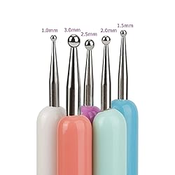 ✒️ The embossing stylus set have total 10 ball ends, 5 different diameters (1.0/1.5/2.0/2.5/3.0 mm). Rounded tip protects the paper from cutting and tearing, double-ended metal ball makes the tracing stylus convenient to use when making art nails or craft projects. ✒️ All metal balls of the tracing tool made of high-quality stainless steel, durable and sturdy. Different colorful of plastic handle make the carbon paper stylus easy to be distinguished. ✒️ Each embossing stylus for carbon paper is 13.2mm/5.2in length, 8.0mm/0.3in diameter, 7.0 gram, proper size and lightweight, easy to hold and grip. ✒️ Set of 5 embossing stylus for transfer paper in multiple sizes end tips, suitable for shading and precision writing. ✒️ The dual-tip stylus embossing tool is widely used for tracing, transferring, embossing, drawing, painting, engraving, sculpting, gilding, dotting, making dots on carbon paper, nail art, polymer clay, soft sugar, cake decoration, etc.