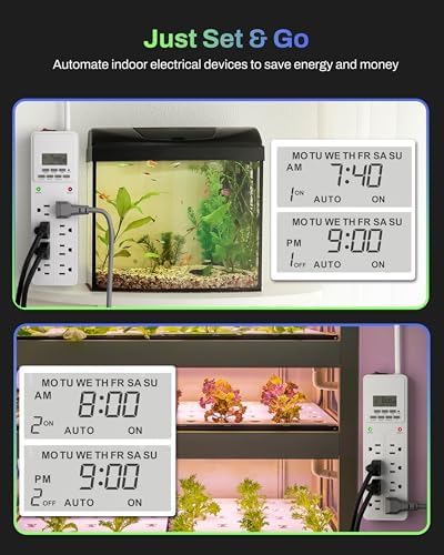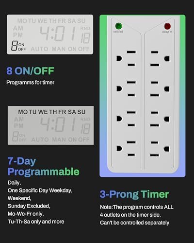 - ✓ VERSATILE & CUSTOMIZABLE: Easily set up to 8 on/off programs for the timer’s 4 grounded outlets. Outlets are controlled simultaneously, and settings can be as short as one minute.