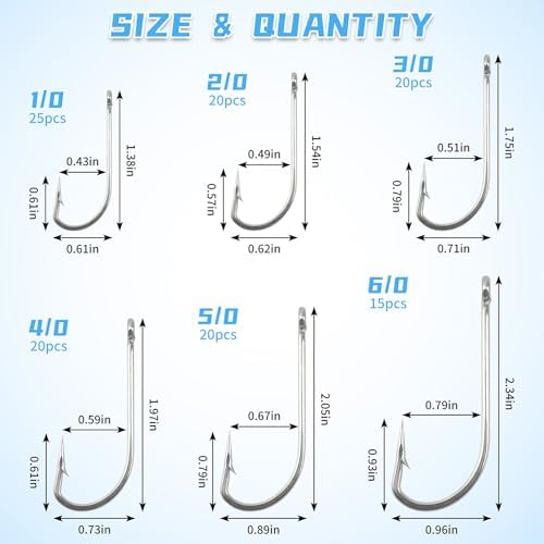 - Pacakge Includes: 120pcs Fishing hooks kit, including 6 sizes hooks - 25pcs 1/0, 20pcs 2/0, 20pcs 3/0, 20pcs 4/0, 20pcs 5/0, 15pcs 6/0.
