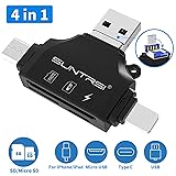 4 in 1 Multi-Interface: The memory card reader has various interfaces: USB, USB-C (Type-C), micro USB, SD card slot, micro SD card slot, and iOS charging port for iPhone/iPad. Easily transfer files between different devices, ideal for photographers traveling on the go. Simultaneous Charging & Card Reading: This 4-in-1 card reader adds a charging port, allowing you to charge your device while reading or transferring files, perfect for outdoor adventures like hiking or camping. No need to worry about running out of battery while transferring files. Compatibility: The sd/micro sd card reader support all iPhone with iOS 8.0 and up and iPads with iOS 8.0 or later/OTG Android phone/computer and other devices with usb port,Maximum support memory card capacity 512GB Real-Time Sharing and Data Management: High speed two-way transmission, the sd card reader for iphone suitable for data transmission between iPhone/Android/computer and other devices, providing intelligent file viewing and management functions, browsing documents, pictures, watching videos, listening to music, etc. Small and Portable:The slim and sleek design + keychain design allows the sd card reader to be placed into your pocket,Prevent loss and carry the micro sd card adapter with you