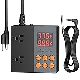 ✓ VARIETY OF USES: The heating and cooling thermostat can be used for seedling germination, rooting, brewing, heating, fermentation, aquarium, and more! keep your various environments in their ideal temperature range. Support multi-scene and multi-purpose use. Enrich your life and bring you happiness. Also features a 71 inch power cord and 71 inch probe cord for flexibility ✓ DUAL OUTLET & DUAL FUNCTIONALITY: The professional dual digital outlet three-prong ground plugs thermostat controller is capable of controlling a heating and cooling device simultaneously. Bring you great convenience by replacing those controllers that only have a single function ✓ SET AND GO: The digital reptile aquarium thermometer have clear display screen, flexible buttons, and sensitive socket contacts. Simply set the temperature probe, plug-in the controller, and use the large 6-button interface to choose your desired temperature setting. Digital display supports units in both Fahrenheit and Celsius ✓ PROFESSIONAL GRADE: The tempature controlled heater cooler own high-accuracy waterproof temperature probe with working temperature from -58 to 230°F; Controller with working temperature from -40 to 176°F. Maximize its functions SAFE & RELIABLE: The advanced thermostat controller comes with overload protection. Rated Voltage is 125VAC 60Hz, Max Loading: 15A/1875W, 1/2HP, TV-5