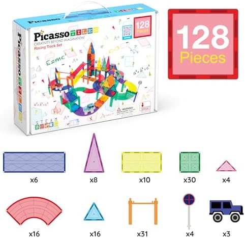 PicassoTiles 128pcs Magnetic Race Car Track Building Block Educational Toy Set Tiles Magnet Playset 3 LED Car STEM Learning Construction Kit Fine Motor Skill Training Brain Development for Kids Age3+