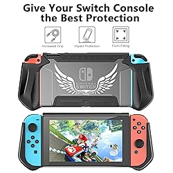 【12 IN 1 Accessories Bundle】 The complete assesories kit include whatever you need : 1x Carrying Case, 1x TPU Protective Cover Case, 1x Adjustable Playstand, 1x Tempered Glass Screen Protector, 2x Grip, 2x Grip Steering Wheel, 2x Joystick Caps,1x USB Charging Cable. 【Hard Shell Travel and Storage Case Compatible with Nintendo Switch】Design to fit complete system(console, dock, power adapter.grip, grip straps, and HDMI cable) and extra Switch Pro controller, hold 18 game cards and other little accessories. Comfort shoulder strap and non-slip handle help you easy to carry. Compatible with 2021 Switch OLED model. 【Hand Grip Kits for Nintendo Switch Joy-Con】2 racing steering wheels controller and 2 grip compatible with Nintendo switch;Provides SL and SR buttons on the top of grip to facilitate your game control. Ergonomic design provides superior grip and enhanced comfort, perfect for controller and Must-Have racing games. Each handle is Universal. 【Heavy Duty Protective Case & HD Screen Protector】 TPU Switch cover prevents daily collisions, scratches, dust and fingerprints. The 9H Hardness screen protector can full coverage protect the screen from scratches or dropping. 2 pairs of silicone touch points thumb grips caps, prevent your original analog stick caps from wear and tear. 【Compact Adjustable Stand】- Stand for gameplay provides three viewing angles and better gaming experience. Unique design with charging cable entry, lightweight, foldable and pocket sized, convenient to carry.Portable USB Type-C Cable can charge your grip, dock and console compatible with Nintendo Switch at a safe high-speed charging.