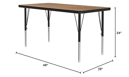 SIZE: 24"x48" Rectangular shaped top Legs easily adjust from 19" to 29" in height in 1" increments Medium Oak colored Melamine laminate surface, offers a smooth writing surface that is harder than real wood Crayon and even Permanent Marker can be removed without damage DURABLE: Designed for the heaviest use in demanding environments such and schools and churches