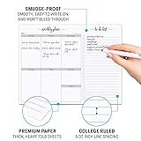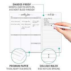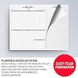 PREMIUM QUALITY: Proudly designed and made in the USA using smooth, heavyweight (70lb) sheets and crisp, clear printing. Notepad is easy to write on, won't bleed through, and perfect for all your favorite pens. PLANNER & CHECKLIST IN ONE: This weekly planning notepad includes boxes for all 7 days of the week on the left and a tear-off checklist on the right so you can take it to go! SO MANY USES: The modern, minimalist, and spacious style of this notepad makes it great for home, school, or the office. Jot down your weekly schedule, appointments, plans, goals, priorities, work tasks, to-dos, grocery lists, or whatever you need to get organized. SIMPLE, SMART DESIGN: (50) 8 1/2 x 11 inch sheets with clean, easy-tear perforation between the undated boxes and to-do checklist. Sheets are edge-glued along the 11-inch side and attached to a sturdy chipboard backing.
