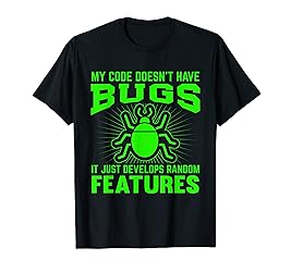 - This funny My Code Doesn't Have Bugs It Just Develops Random Features t-shirt makes awesome apparel for the computer science geek who stays up all night coding script and debugging code. Grab your inanimate object and start rubberducking. This cute novelty graphic t shirt makes a great birthday or Christmas gift for men or women who love programming and digital code. Fun idea for coder boys and girls to wear to high school or college computer labs