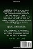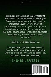 - DECODING INVESTING is an investment handbook that is written to take you from zero experience to becoming a profitable investor. If, prior to purchasing this book, you already have investments, this book can guide you through making more profitable decisions and avoiding common investment mistakes. Highlights of this book are:The various types of investments.How to pick your investment assets.How to build an investment portfolio.Dos and Don’ts of investing.Where to get support during this journeyThe book effectively covers all you should know about investment and is designed to take you from little to no investment knowledge to an enlightened investor. In this book, I explain types of financial assets, their differences, their advantages and their disadvantages. I also talk about financial situations and risk tolerance rates of several investors and how it affects the proportion of several assets in their investment portfolio.The book provides a step-wise guide to building a financial portfolio and tips on guidelines for selecting what stocks and bonds to invest in. The relevance of diversifying ones investment portfolio and increasing its immunity to failure is also discussed in this book. As a disciplined investor, I have provided you with some rules to adhere to. You’re sure to have a net win, if you follow the content provided.