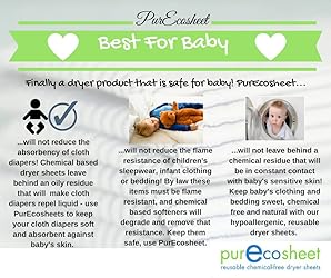 - PurEcosheet has all the advantages of a traditional dryer sheet, with none of the chemicals. Our reusable dryer sheet eliminates static and keeps all of your fabrics fresh, soft and natural without leaving a chemical residue on your family's clothing. It's simple to use - just put both sheets in the dryer with your laundry and they will last for hundreds of loads. Your clothing will be soft and static free, without any added perfumes, dyes, soaps or chemicals. Our dryer sheets are vegan, hypoallergenic and safe for everyone, including infants and eczema and allergy sufferers. Fresh. Fabrics for your family. Unlike traditional chemical based fabric softeners, PurEcosheets:Will not spot or stain even the most delicate clothingWill not reduce the absorbency of cloth diapers or microfiberWill not restrict athletic wicking fabricsWill not reduce the stretch of nylon and spandexWill help reduce energy costs. (Did you know: chemical based softeners leave a residue that clogs the dryer's vents and covers the dry sensors, which makes the dryer work hard and longer to complete the same job. If you use them the manual tells you to clean the inside of your dryer with a strong brush and soap.)Will keep your dryer clean and efficient (Did you know: most dryer manuals tell you that chemical based softeners can void your warranty.)Will not reduce the flame resistance of children's sleepwear, infant clothing (Did you know: by law these items must be flame resistant, and chemical based softeners will degrade and remove that resistance)