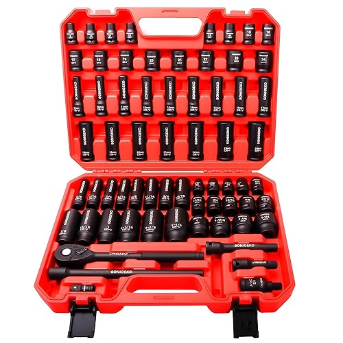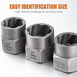 Each stripped bolt extractor set is made of high-hardness chrome-molybdenum steel for superior durability and longer life. It will easily extract damaged bolts, nuts, and screws, even if they are stripped, rusted, or frozen The internal thread with reverse spiral flutes is designed to bite down for maximum gripping power. The more you turn, the tighter the bolt extractor socket set grips The standard 3/8-inch square drive and hex adapter make the lug nut extractor set compatible with hand, air, or power tools 13+1 pieces 3/8 inch drive stripped lug nut remover includes 3/4"(19mm), 11/16", 17mm, 5/8"(16mm), 9/16"(14mm), 13mm, 1/2", 12mm, 7/16"(11mm), 10mm, 3/8", 5/16"(8mm), 1/4", and hex adapter The heavy-duty blow-molded case is for bolt remover and extractor organized storage and easy carry