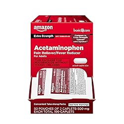 Amazon Basic Care Extra Strength Acetaminophen Caplets 500 mg, Pain Reliever and Fever Reducer, Gentle on Stomach, For Arthritis Pain, Backache Pain and More, 50 Packets of 2 Capsules Each, 100 Count