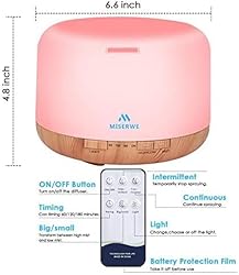 Ultra-Large Capacity: Diffuser have Large 500 ml water capacity that can continue use up to 10 hours each time.4 time setting modes: 60 min / 120 min / 180 min /ON stable o 7 Colors Light & 2 Mist Mode: The oil diffuser can be set to 7 different gentle and soothing colors, press the" LIGHT" button to adjust the LED lights. Press "MIST" button to work, choose ”high/low“ to determine the amount of fog. Remote Operation: Our diffuser are equipped with unique wireless remote control, adjustable switch, fog size, time, light. Allows you to enjoy quiet sleep without having to get out of bed to turn on the machine. Safety and Low Noise: Waterless auto shut off and this diffuser oils fragrance is made from BPA-free materials, Deep Sleep ≤ 20dB, run steady and noiselessly, give you a quiet and comfortable environment. Premium Options: Perfect for bedroom, study, office, living room, bathroom, yoga, SPA, conference room, baby room.Is the best gift choice