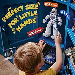 【𝐏rogrammable】The programmable robot supports up to 50 motion combinations programming, which can help develop your kid's creativity. And the one-key demo can demonstrate a set of dance with music to bring your kids a fun time with the smart robot. 【𝐆esture and 𝐑emote 𝐂ontrol】Simple hand gestures move the robot forward, backward, left, or right, while the multi-button remote unlocks dances, demos, and more exciting play—bringing nonstop fun and laughter to kids. 【𝐒ing & 𝐃ance】Ruko robot toy can not only walk, slide but also have the function of singing and dancing. Dynamic music and dance will bring fun to children. There is a volume control on the remote, you can adjust as needed. 【𝐄asy 𝐂harging, 𝟏𝟐𝟎mins 𝐅un 𝐓ime】Powered by built-in rechargeable batteries, the robot toy easily charges via USB—whether from a power bank, adapter, or computer. A quick 2-hour charge brings up to 120 minutes of exciting playtime. 【Flexible & Safe Design】Built with sturdy ABS material and flexible joints for smooth, natural movements, this remote control robot ensures safe, enjoyable play, making it a reliable companion for kids ages 3–6. 【𝐆ift 𝐂hoice 𝐅or 𝐊ids】Meet your child’s new favorite playmate! Designed for kids ages 3–6, the Ruko RC Robot makes a gift that’s sure to bring endless smiles and excitement.