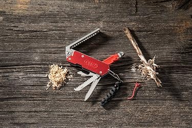 Flint wheel ignition (includes 1 flint) 420 High-carbon steel knife blade Fire paracord: wax-coated red strand; 15 in. / 38.1 cm. length Double cut saw blade, flathead screwdriver, bottle opener, & bail Dual flint storage & tinder grater