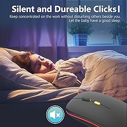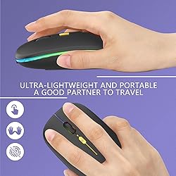 【LED Design】The upgraded version mouse with the LED lights adds more fun to the boring office life. The bottom of the mouse has a switch, you can switch lights freely. Low-key or sparkle, switch in one second, suitable for any occasion. 【Rechargeable Optical Mouse】Built-in durable rechargeable battery, it can be easily charged using the included USB cable without replacing the battery. Just 2 hours charging, you can use it about 7-15 days. Standby time is very long, energy-saving features, automatic sleep mode and wake-up mode are installed to save energy. Turn off the mouse LED light when not in use to save power. 【Plug and Play】No need to install any driver, just plug the USB receiver into your laptop will the mouse start to serve. 2.4GHz wireless technology provides powerful and reliable connection, effective up to 10 meters of range. Advanced optical tracking technology with fast click and responsiveness. 3-Level adjustable DPI (800/1200/1600 DPI), freely to satisfy daily work. Equipped with USB-C to USB adapter, let you worry-free use of any device. 【Mute Click & Comfortable Hand-feeling】Silent click Mouse with classic design with anti-fingerprint finish offers your hand maximum support and comfort. Silent button reduces 90% noises, which makes it an ideal wireless mouse for office, conference room, cafe, library, bedroom, help you concentrate on your work, study without disturbing others besides you. Ultra-thin, ergonomic design, lightweight and convenient for carrying or traveling. 【Wide Compatibility】Well compatible with Windows XP, Vista, 7, 8, and 10 / Windows Vista / Windows Vista/ Windows ME etc, Fits for desktop, laptop, PC, Macbook and other devices. Please Note: If your laptop just with type-c port, You need connect the supplied USB-C to USB adapter to your laptop and plug the USB receiver in to it.