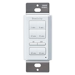 AUTOMATIC CONTROL: Our Etoolcity countdown timer switch with 6 selectable time opitions, once the time selected expires, exhaust fans automatically switch off, keep your bathroom, laundry room fresh, mildew and mold away NO DISTURB AT NIGHT: Eight button countdown timer switch with 6 countdown times: 1-5-10-15-20-30 min, you can choose the right time to turn off your bathroom fan, ensure you a good night's sleep and energy saving. Make your life easier and smarter BLUE LED INDICATE: Blue LED lights will stay on, easy to locate in darkness. Also remind you which button is now working. Due to the bright LED light, bedrooms are not recommended for this feature SAFE AND RELIABLE: This bathroom fan timer switch is made of flame retardant material, more stable. Higher power allowance up to 1800W WIDE APPLICATION: This fan timer switch is ideal for bathroom, closet, pantry, garage, laundry room and more. Compatible with LED, CFL and incandescent, etc