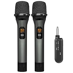 【UHF WIRELESS MICROPHONE】VeGue WM-2 is UHF wireless microphone,which is designed to get less susceptible to interference than the VHF one. The microphone is not bluetooth microphone and not rechargeable. The receiver is 6.35mm Jack which can compatible with most of the karaoke machines. 【STABLE SIGNAL TRANSMISSION】This dual-channel handheld wireless microphone set provides 15 frequency options for each channel with 200 feet stable signal distance and supports 15 sets of microphones that can be used simultaneously. 【PREMIUM SOUND QUALITY】 Equipped with a professional chipset, this dynamic wireless microphone will reproduce clear sound without distortion. The built-in noise reduction cotton effectively reduces the noise generated during use. Ideal for singing, karaoke, party, speech, wedding, meetings, and live performances. 【EASY TO USE】 Plug and play, automatically pairing. The receiver can be directly plugged into devices with a 1/4" MIC jack, such as karaoke speakers, power amplifiers, and PA systems. ★Note: Not suitable for phones and computers. 【RECHARGEABLE & DURABLE】 The portable receiver built with a rechargeable battery comes with 2-3 hours of charging time and up to 6 hours of working time. Both the receiver and the microphone body are made of aluminum alloy which is sturdy and lightweight. 【WHAT YOU GET】 2 x handheld microphones, 1 x rechargeable receiver with a 6.35mm plug, 2 x anti-slip rings, 2 x mic covers, 1 x USB cable, and 1 x manual. (Note: Do not use the product when charging, or it will cause short-circuit and damage the battery.)