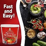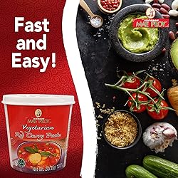 AUTHETICALLY THAI AND VEGETARIAN: with Mae Ploy vegetarian Thai red curry paste, serving up the same great taste that you've enjoyed during your last vacay in The Land of Smiles or of your favorite Thai restaurant may now be easier. NOTHING THAT SHOULDN'T BE THERE: Mae Ploy Thai red curry paste doesn't contain MSG, preservatives and artificial colorings. It's packed to the brim with an aromatic blend of aromatic Thai herbs and spices such as lemongrass, kaffir lime peel, galangal (a type of ginger), among others. SO MANY WAYS TO USE IT: get creative in your kitchen and get your family and friends craving for more with Mae Ploy vegetarian red curry paste. It'll add that special kick to your veggie stews, curries or soups and gorgeous red color in dipping sauces. It can also be a savory marinade, seasoning or pasta sauce for all types of grilled vegetables, pizzas, salads and more. RESEALABLE TUB FOR OPTIMAL HYGIENE: Mae Ploy red curry paste comes in a tub with a resealable lid that you can securely keep any leftover curry paste. Ultra-convenient when you only need a portion of the curry paste for cooking every time. QUALITY ASSURANCE YOU CAN TRUST: Mae Ploy vegetarian red curry paste is manufactured in Thailand in a GMP-approved factory observing HACCP (Hazard Analysis and Critical Control Points) regulations. The factory has also been inspected by the FDA and agencies assigned by international clients, so you can rest assured that the Mae Ploy Thai curry paste you've in the pantry is of the highest quality.