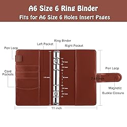 Premium PU Leather A6 Binder: Durable and stylish 6-ring notebook binder made from PU leather, offering a sleek, professional look while protecting your A6 refillable planner pages. Perfect for daily use at home, work, or travel Sturdy 6-Ring Metal Mechanism: Features stainless steel, nickel-plated rings (2cm inner diameter) for smooth opening/closing. Holds 80-100 sheets of A6 refill paper securely without tearing, ensuring long-lasting use Multifunctional Storage Design: Binder's inner design with hidden compartments, card slots, and dual pen loops to organize pens, passports, ID cards, bank cards, cash, and notes. Ideal as a budget planner, travel wallet, or business organizer Compatible with A6 Binder Pockets: Pair with A6 binder pockets or cash envelopes for a cost-effective money organizer system (great for budgeting, receipts, or coupons). Note: Binder only; refills/pockets not included Compact & Portable (7.48" x 5.2"): Lightweight yet spacious, this A6 planner binder fits easily in handbags, backpacks, or suitcases, making it perfect for office, school, travel, or everyday errands