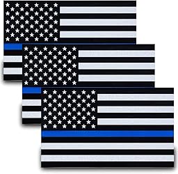 - Include 3 x USA Flag Sticker Thin Blue Line 5x3 inch. Show Your Support Show support for the men and women in active duty, appreciate the retired officers, and pay respect to the many LEOs that have sacrificed their lives on the job.. Durable Premium Quality WIth reflective blue line in the middle, reflective white lines and reflective stars. Weatherproof, UV & Water Resistant, our flag sticker is made for outdoor and indoor long last without fading. Peel and Stick Ensure that the surface is dry and clean. Just clean the surface, spray some water, peel the backings and apply to wherever you want. Paint Safe Removable Back Glue Sticks Removable back adhesive will not damage car paint, removable easily, leaves no glue on the surface. Clear Printing The sticker is digitally and clearly printed. Non-reflective for added safety in low light or night time driving conditions, avoid to disturb the drivers behind you.