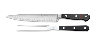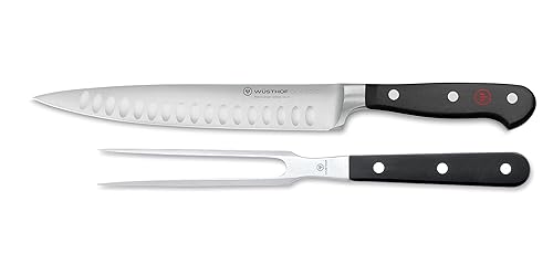 Set includes 8-inch carving knife with a hollow ground edge and 6-inch straight meat fork Newly updated Wusthof Classic line features new Trident Logo inlay on handle and etched on blades Forged blade, weighted bolster and full tang from a single blank of Wusthof premium high-carbon stainless steel Hand-honed 14 degree per side edge is very sharp and easy to maintain; Classic triple-riveted handles Made in Solingen, Germany; Manufacturer's lifetime warranty