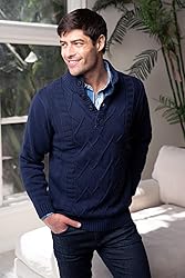 - 100% Cotton Men's 4 Button Down Collar Knitted Pullover Sweater Ribber cuffs, neckline, and hem Diamond Cable Knit Design
