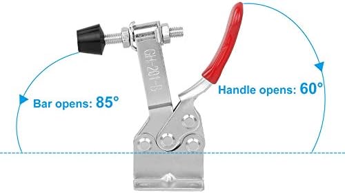 - Toggle Latch Clamp: The hold down clamps for woodworking model is GH-201-B. Holding Capacity: 163Kg/360Lbs, its size of the hole is 6 mm (L x W); Arm opens 85° while handle moves 80°
