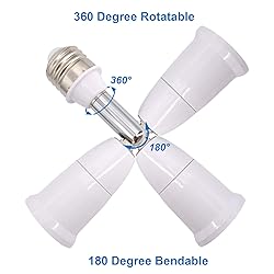 E26 to E26 SOCKET EXTENDER. Total length---5.5 inch, Extended length---4.5 inch. Bending degree is 180, Horizontal 360°. Ideal for Standard E26 E27 Light Bulb. FUNCTION: Light Bulb Converter ideal extender to lower your bulbs further in recessed fixture, allow light to disperse around the room, and almost adjust any angle you want. Use this socket extender for photography, illuminating homes, offices, workplaces, etc. FEATURES: Safe and easy to install. Adjustable neck and head vertically angles up to 90 degrees. Head can also rotate 360 degrees in either direction Horizontally. SAFE&STURDY: Durable and Long Life, flame-retardant ABS plastic and copper, no fire hazard. No need for tools, easy to screw in. Wattage range: 0~ 60W. Voltage range: 100~240V. SERVICE SUPPORT: Any issue about our E26/E27 Bulb Socket Extender, please feel free to contact us for help, we will reply you within 24 hours.