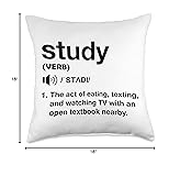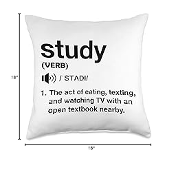 100% Polyester Study Definition: The act of eating, texting, and watching TV with an open textbook nearby Funny gift idea for all who love to procrastinate. For daughter, son or friends who hate to learn for school, college or university 100% spun-polyester fabric Double-sided print Filled with 100% polyester and sewn closed Individually cut and sewn by hand Spot clean/dry clean only
