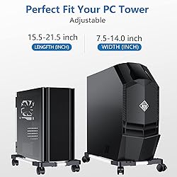 - Extra Large Mobile CPU Stand Adjustable Computer Tower Stand with 4 CasterPackage included:8 parts: 4 corners, (two with locking casters), and 4 rails (2 short, 2 long)Cooled down CPU temp.Easy assemblyAdjustableheight and widthVery rugged - holds a lot of weightOpen bottom for optimized air flow This is easy to assemble, all the corners had friction-toggle clamps so they were infinitely and easily adjustable. The top had ridges so it should be stable when you moving your heavy, full-sized tower case.It’s easy to adjust and makes for a perfect fit for large computersTwo wheels also lock so that the computer won't be rolling around easily.Size:Length: 15.5-21.5 inches / 42-58cmWidth: 7.5-14.0 inches / 21-37cmFits most of PC, Fits 6"-14" wide PC tower, fits 15"-22" long PC tower, allowing it to accommodate most computer towersLong/wide enough to accommodate most sizes.Color: BlackMaterial: Metal and ABS DurableHeight: 2.76inches/7cm