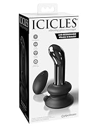 - Icicles #84 Black Curved Vibrator from Pipedream Products. Icicle No. 84 is designed to create the ultimate experience in arousing solo sex sessions or share it with a partner for a sublime sexual adventure! This multi-function vibrating glass p-spot plug features a curved tip for precise pleasure, and a flared base for easy retrieval. The included wireless remote puts the control at your fingertips or even better, in the hands of your partner! Cycle through 10 unique vibration patterns for truly intense, sheet clutching orgasms! A powerful, removable silicone suction cup base holds Icicle. No. 84 to reach those perfect spots. With its powerful silicone suction cup base holding the plug securely in place, you will get thrilling stimulation right where you want it. Stick it to the floor, wall, bedpost, or almost any flat surface you will be amazed how it stays put during every passionate thrust! Plus, the vibrator is waterproof, so turn bath time into play time! Experience the fun and discover endless possibilities! Elegant, upscale, and hand crafted with amazing attention to detail, this luxurious line of glass massagers will leave you breathless. Each hand-blown Icicle glass plug is sleek, unique, and made to play hard. Caution: handle with care. Glass plugs can be very slippery when wet or lubricated. If dropped onto a stone or tiled floor, the glass may chip or break. Always inspect the plug before use, and discontinue use immediately if damaged. Rechargeable wireless remote included. The single button rechargeable remote controls 10 vibrating functions and puts all the power at your or a partner's finger tips!