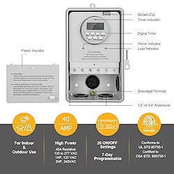 - Suraielec Outdoor Indoor 7-Day Programmable Digital Timer Switch Box for Powerful Electrical Appliances Save yourself time, money, and hassle by getting our Suraielec automatic digital pool timer. After setting it, it keeps your pool running on a regular schedule without forgetting to turn it off so your water stays clean without creating outrageous electricity bills and you won't have to lift a finger. It also saves you chemical and maintenance costs from failing to run it as often as you should. You won't run the risk of forgetting to run your filtration system or having to leave it off if you go out of town. It also turns on your holiday lights or schedule the sprinklers without even having to step outside, avoids the inconvenience of plugging and unplugging your outdoor lights, holiday decorations, and other high-power appliances. Up to 20 ON/OFF program settings satisfy customers' most needs easily. 15 day combinations repeat cycle options are easy to select and bring convenience to you. This digital pool pump timer is smart enough to automatically adjust for daylight savings time. Do not need to reset the clock twice per year. 120-277VAC, 40-Amp Resistive, 2HP Heavy Duty Timer Controls and Schedules Large Load Devices Pool Pump Spa Control Hot Water Heater Submersible Pump Air Compressor Irrigation System HVAC Equipment Pool's Filtration System Water Fountains and Music System Exhaust, Attic, and Circulation Fan Electronic Entertainment Control Landscape, Patio, Christmas Holiday Light Outdoor Lighting and Seasonal Decoration Other High Power Appliance, and Workstation.